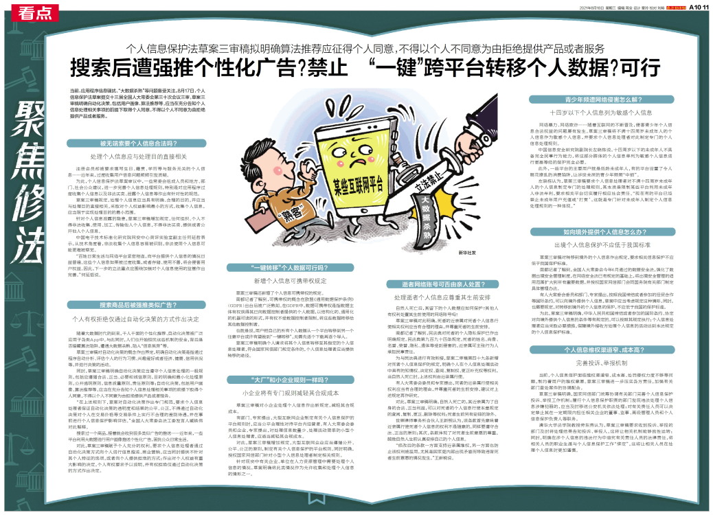 当前,应用程序信息骚扰、“大数据杀熟”等问题备受关注。8月17日,个人信息保护法草案提交十三届全国人大常委会第三十次会议三审,草案三审稿明确自动化决策,包括用户画像、算法推荐等,应当在充分告知个人