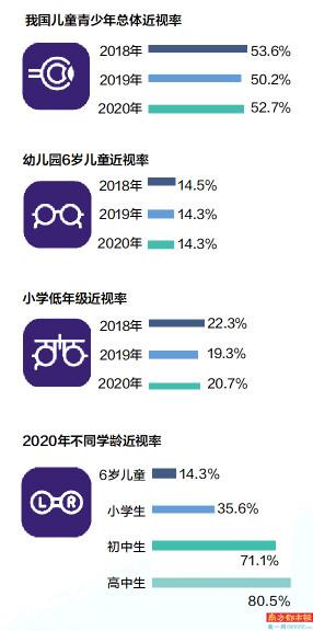 2020年9月-12月,国家卫生健康委开展了近视专项调查,共筛查247.7万名学生。调查显示,2020年,我国儿童青少年总体近视率为52.7%;其中6岁儿童为14.3%,小学生为35.6%,初中生为71.1%,高中生为80.5%。而小学低年级学生近视率为20.7%,较2019年增长1.4个百分点,较2018年下降1.6个百分点。