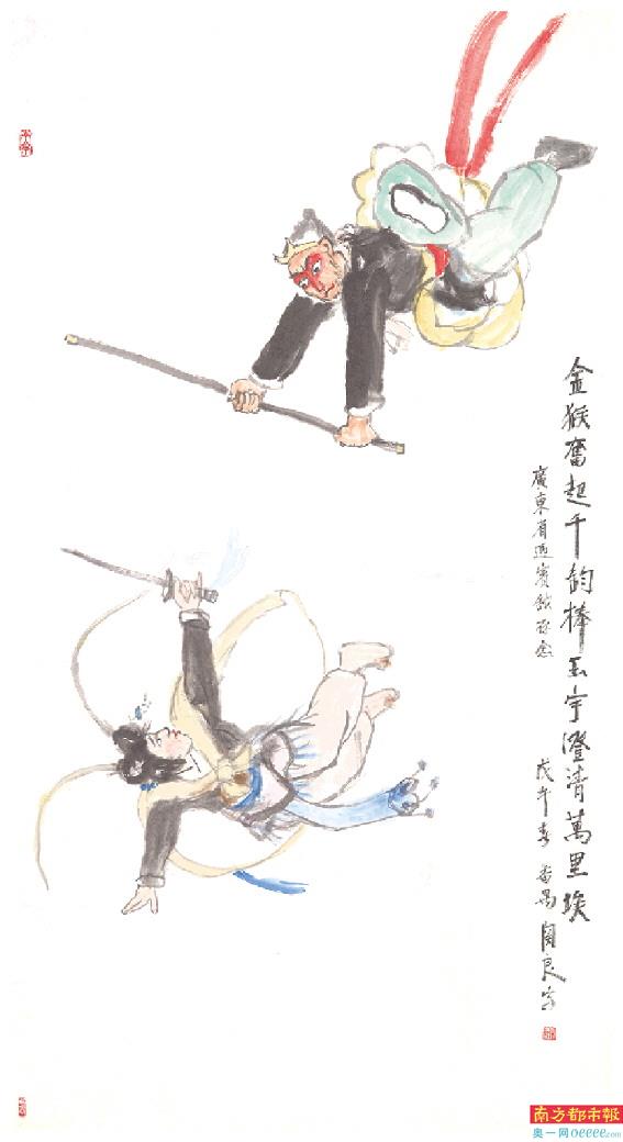 广东美术馆馆藏的这幅《孙悟空三打白骨精》是少见的大尺幅作品。关良让悟空高高腾起,形成对白骨精的强烈压迫感,整个画面大开大合。这种上下的空间感在戏曲舞台上是很难实现的,关良却把它在画上实现了。