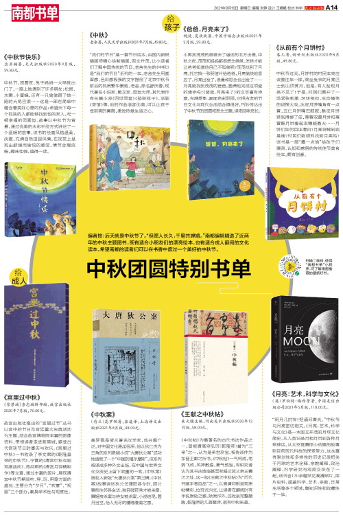 编者按:后天就是中秋节了。“但愿人长久,千里共婵娟。”南都编辑精选了近两年的中秋主题图书,既有适合小朋友们的漂亮绘本,也有适合成人翻阅的文化读本。希望南都的读者们可以在书香中度过一个美好的中秋节。