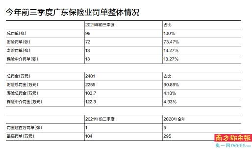 2021年前三季度,广东银保监局及辖内银保监分局、深圳银保监局对财险机构开出72张罚单,占广东保险业整体罚单总数的73.47%;从罚金数额来看,财险业被罚2255万元,占广东保险业罚金总规模的90.9%。