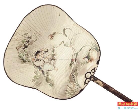 如果想寻找蓬洲扇,大约只能去博物馆了。广东博物馆收藏有二把清代的“潮州鲎壳扇”,此也即蓬洲扇。其一为“彩绘刘海戏蟾”,扇长25厘米,宽22厘米,其状如鸭掌,扇骨和扇柄均为竹制,以细线将60枝极细匀的扇骨编排成扫把状,两面糊纸,再以绢锦包边成扇,并彩绘刘海戏蟾的人物故事,该扇做工考究,轻便细巧。另一把为“彩绘人物故事图”,扇长29厘米,宽24.5厘米,其做法与“刘海戏蟾”扇相近,象牙柄,竹编边框,63条竹制扇骨,麻质扇面上以设色水墨彩绘文人休闲图。
