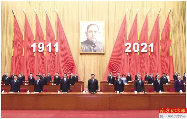 人民大会堂大礼堂气氛庄重热烈。主席台上方悬挂着“纪念辛亥革命110周年大会”会标,后幕正中是孙中山先生画像,10面红旗分列两侧,上面悬挂的“1911”“2021”字标格外醒目。