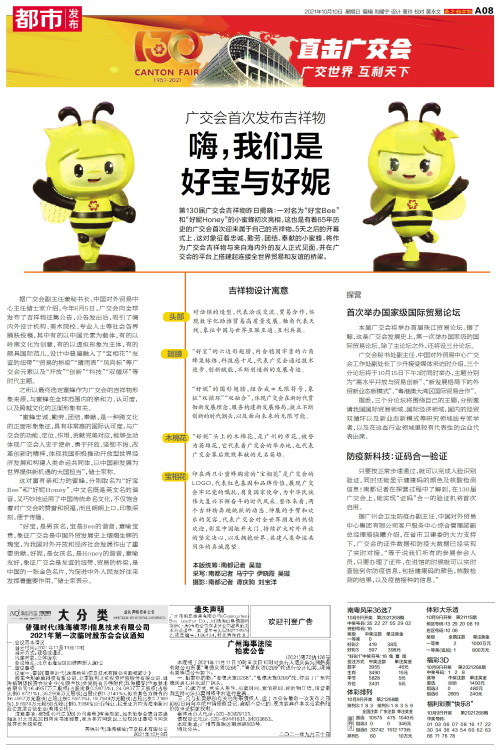 第130届广交会吉祥物昨日揭晓:一对名为“好宝Bee”和“好妮Honey”的小蜜蜂初次亮相,这也是有着65年历史的广交会首次迎来属于自己的吉祥物。5天之后的开幕式上,这对象征着忠诚、勤劳、团结、奉