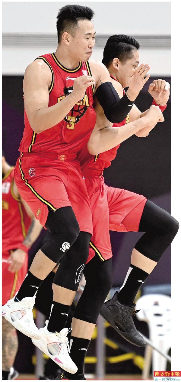 贺希宁(左)与沈梓捷庆祝球队逆转上海男篮。 新华社发