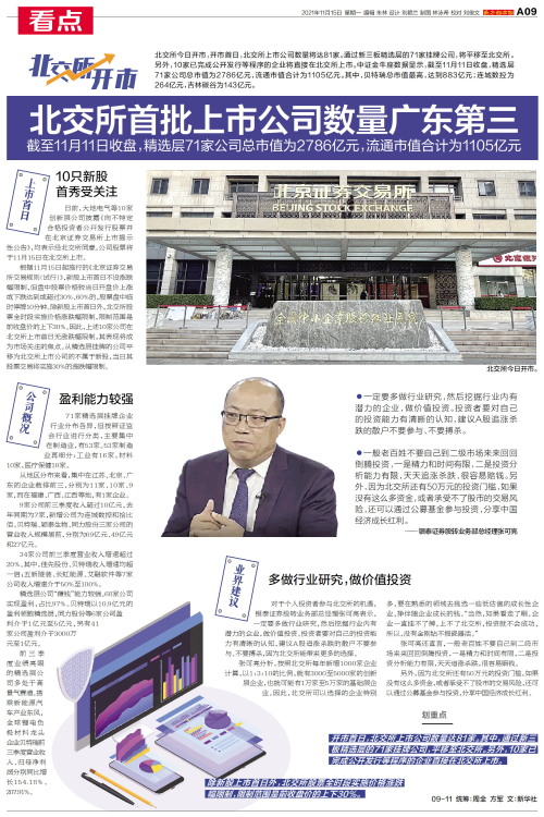 北交所今日开市,开市首日,北交所上市公司数量将达81家。通过新三板精选层的71家挂牌公司,将平移至北交所。另外,10家已完成公开发行等程序的企业将直接在北交所上市。中证金牛座数据显示,截至11月1