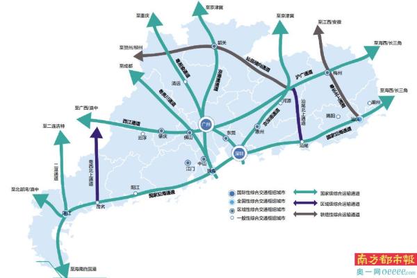粤贵川通道:起自粤港澳大湾区,经珠海、中山、江门、广州、佛山、肇庆,至广西,连接成都。