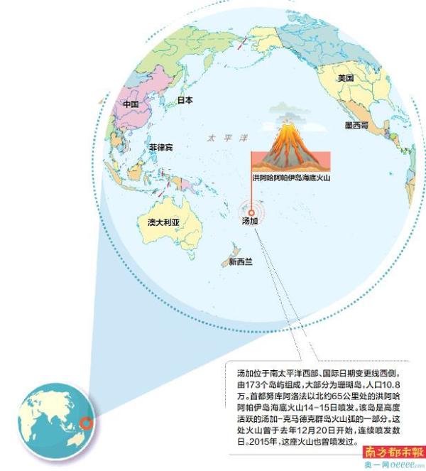 南太平洋岛国汤加的洪阿哈阿帕伊岛1月14日和15日发生海底火山喷发,首都努库阿洛法观测到海啸。日本、美国、加拿大、新西兰、斐济、萨摩亚、瓦努阿图、澳大利亚和智利均发布海啸预警。专家指出,事发地火山口已苏醒,喷发活跃期可持续数周甚至数年,尚不清楚目前是否已达喷发的峰值。