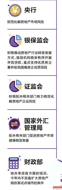 近日,多个部门对房地产市场运行作出表态。央行表示,“防范化解房地产市场风险”;银保监会表示,“积极推动房地产行业转变发展方式,鼓励机构稳妥有序开展并购贷款,重点支持优质房企兼并收购困难房企优质项目”;证监会表示,“积极配合相关部门有力有效化解房地产企业风险”;国家外汇管理局表示,“配合有关部门促进房地产市场健康稳定发展”。