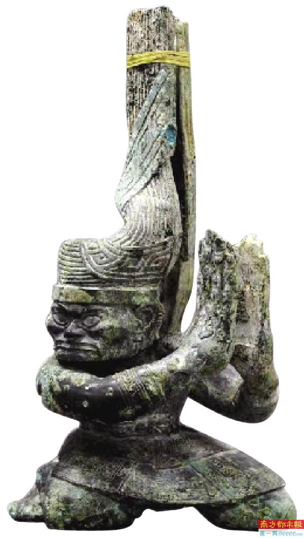 ←四川广汉市三星堆商代遗址出土的铜扭头跪坐人像。
