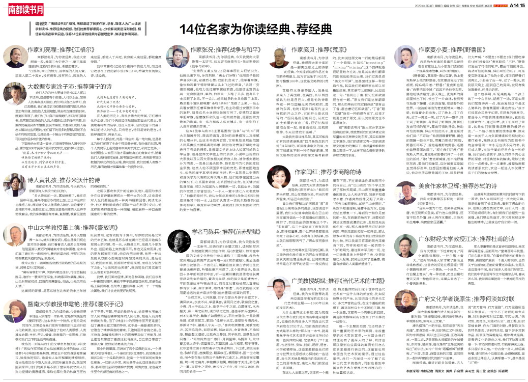 编者按:”南都读书月“期间,南都邀请了很多作家、学者、媒体人为广大读者录制读书、推荐经典的视频。他们的推荐都很用心,分析解说更是深刻独到,相信会给读者带来启迪。现将14位名家的视频内容整理出来,供