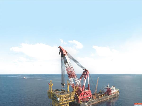 亚洲顶级起重船“蓝鲸”号进行“海基一号”平台上部组块吊装作业。 中国海油供图