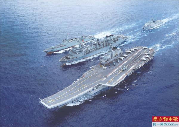 又过了一年以后,辽宁舰通过台湾海峡,奔赴祖国的南海。2015年7月,辽宁舰首次组织实弹射击,取得了全部命中的好成绩。2016年起,以辽宁舰为核心的航母编队多次赴南海、西太平洋等海域开展实战化训练,开始推动全要素、全流程整体训练。