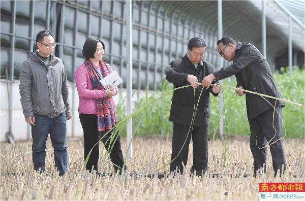 宁夏银川市永宁县,福建农林大学教授林占熺(右二)与农户交流菌草种植技术。