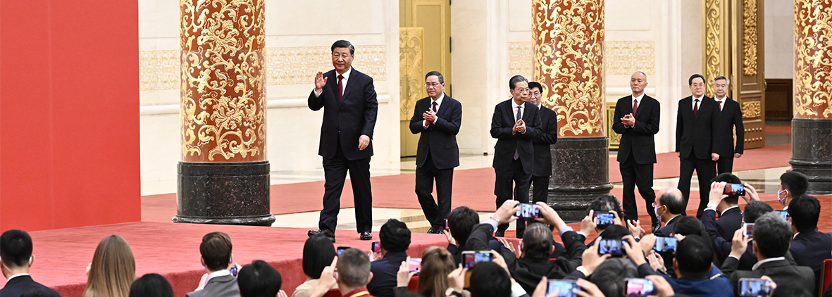 习近平总书记同李强、赵乐际、王沪宁、蔡奇、丁薛祥、李希同志走入金色大厅,霎时间快门声密集响起、闪光灯亮成一片,如潮的掌声响彻全场。