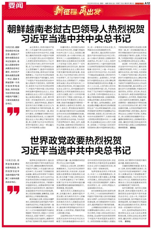 习近平当选中共中央总书记10月23日,世界政党政要纷纷致电致函,热烈祝贺习近平当选中国共产党第二十届中央委员会总书记。