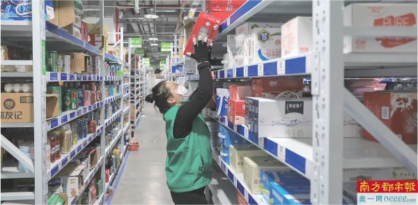 广州海珠区昌岗配送站,分拣员在货架间打包市民订购的货品。 南方日报记者 张冠军 摄