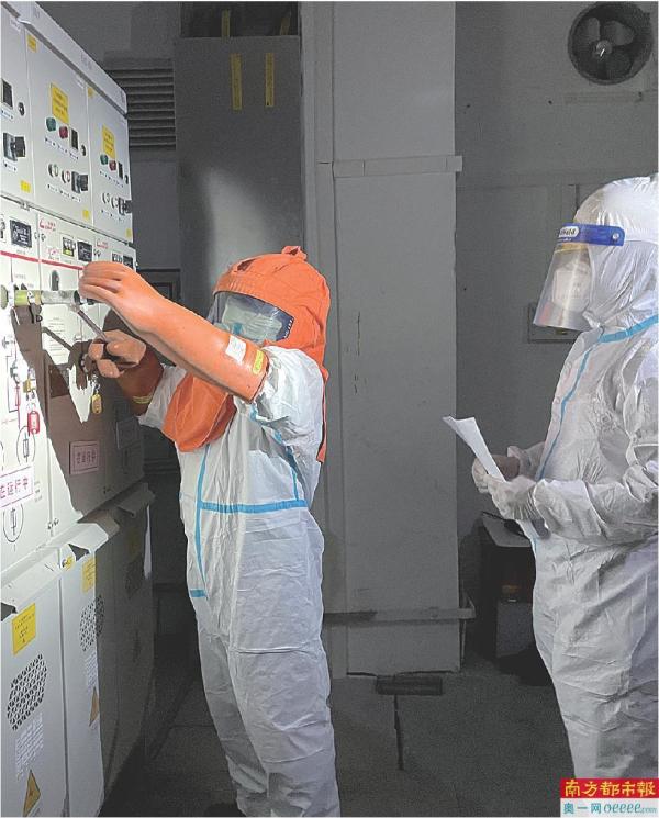 花都供电局工作人员在防疫临时隔离点进行投产送电前的调试工作。