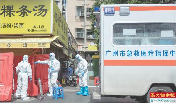 广州海珠区客村管控区入口,救护车在等候转运。 南方日报记者 梁钜聪 摄 (资料图)