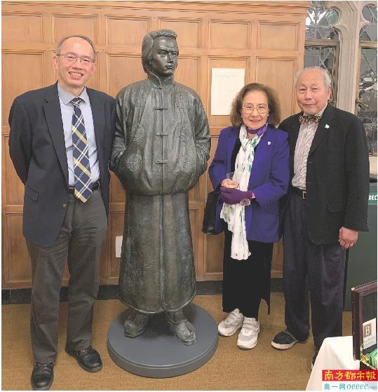 孙康宜等人与中国留美先驱容闳铜像合影(左一为耶鲁大学东亚图书馆馆长孟振华,右一为孙康宜的丈夫张钦次),摄于2019年。