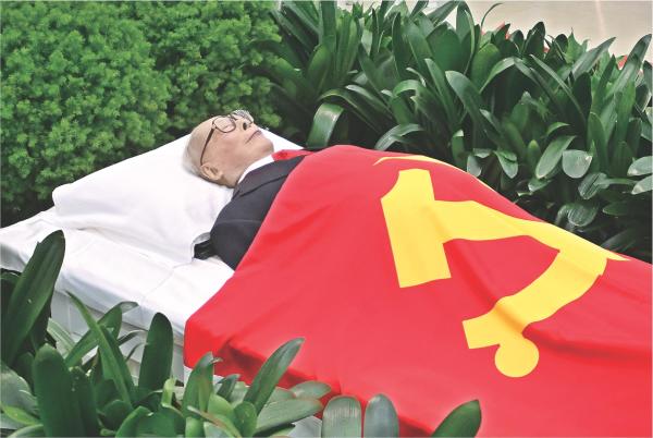 12月5日,江泽民同志的遗体安卧在鲜花翠柏丛中,身上覆盖着鲜红的中国共产党党旗。 新华社发