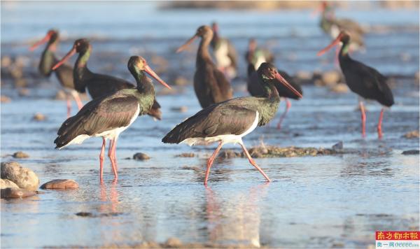 12月22日,一群黑鹳在河北省井陉县境内的绵蔓河觅食。黑鹳是世界濒危珍禽,属国家一级重点保护野生动物,因数量稀少,被称为“鸟中大熊猫”。新华社发