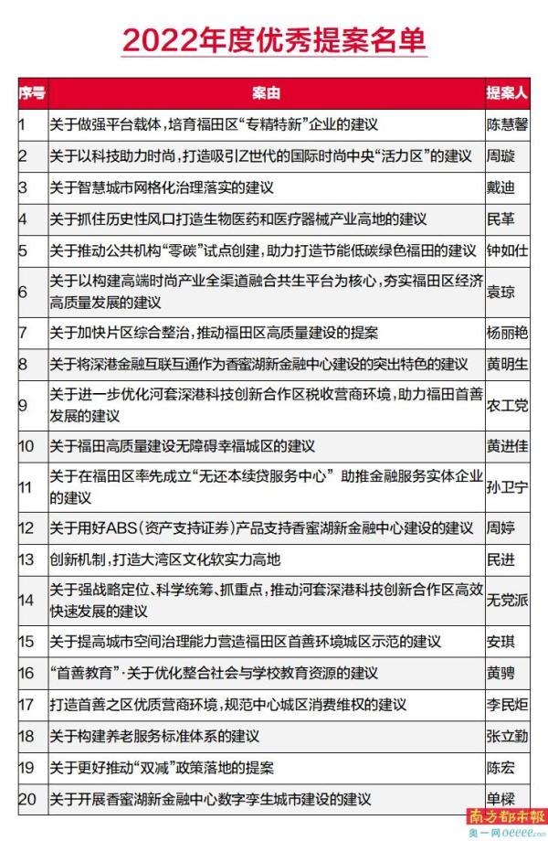 区政府以“先行示范”要求和“首善之区”标准,认真吸纳各位委员提出的意见提案,深入研究解决提案反映的实际问题,推动提案全部办理完毕并逐件答复,实现部门答复率、提案办理率、按时办结率、委员满意率“四个100%”。2022年度,全体政协委员认真履行政协职能,为促进福田经济发展、社会和谐发挥了应有的作用。为进一步提高提案工作质量,提案委根据提案工作综合评议结果,评选出20件优秀提案。