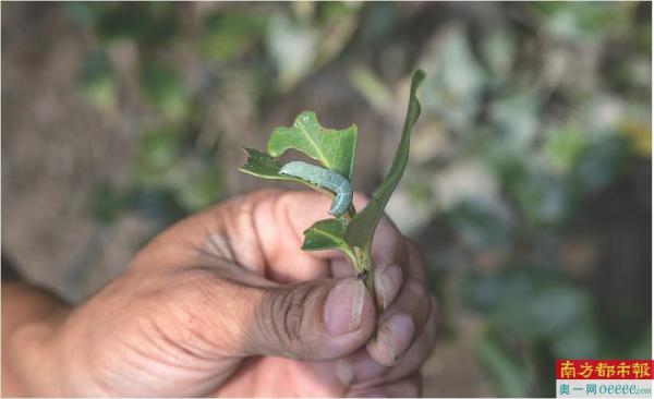 林广旋摘下有柚木驼蛾幼虫的枝叶,准备放到瓶子里带回去,那幼虫似乎意识到危险,开始变得活跃,吐着丝到处乱爬。