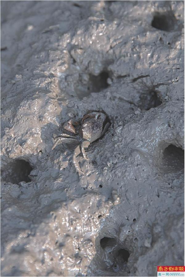 涨潮前,外壳被泥浆包裹着的细长的火筒螺,正努力往树上爬。