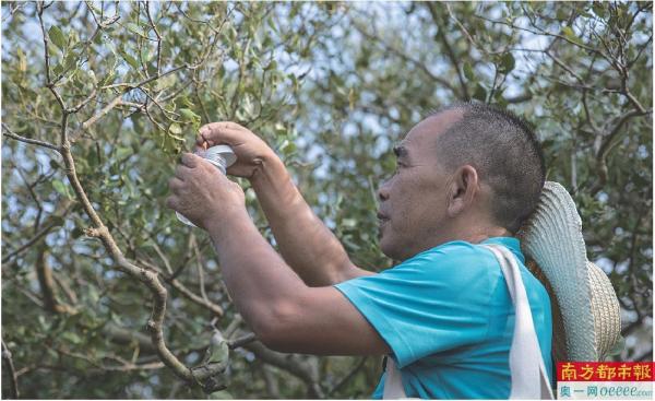 石灰水尽管能起到一定效果,但不可避免的是会对红树林里的其他生物如鱼虾等造成影响,林广旋则更倾向于通过生物防治的方式来解决虫害问题。“上周三,我们刚去采集了一些自然死去的幼虫,寄到北京的科研单位,从里面提取一种叫白僵菌的真菌,想用来生产一些生物性农药,喷洒到红树林里,现在还是在初步的科研阶段。”