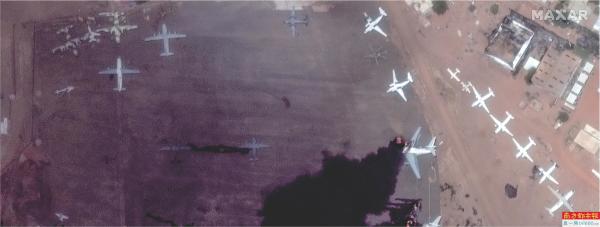 4月16日的卫星图像显示苏丹喀土穆国际机场上空升起浓烟。