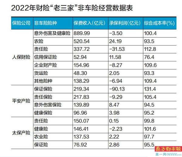 人保财险2022年前三大非车险险种即意健险、农险、责任保险。其中,农险实现原保险保费收入520.54亿元,同比增长22.0%;承保利润24.19亿元,有效改善盈利水平。但意健险、责任险出现了承保亏损的情况,人保财险意健险业务综合成本率100.4%,同比下降2.2个百分点,承保亏损3.5亿元,但同比减亏16.02亿元;责任险承保亏损最高,达31.53亿元。