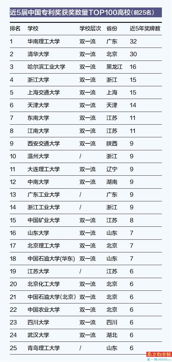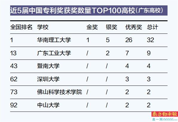 在广东,华南理工大学、广东工业大学、暨南大学、深圳大学、佛山科学技术学院、中山大学等6所广东高校进入百强高校榜,在近5届中国专利奖中共获得52项奖励。