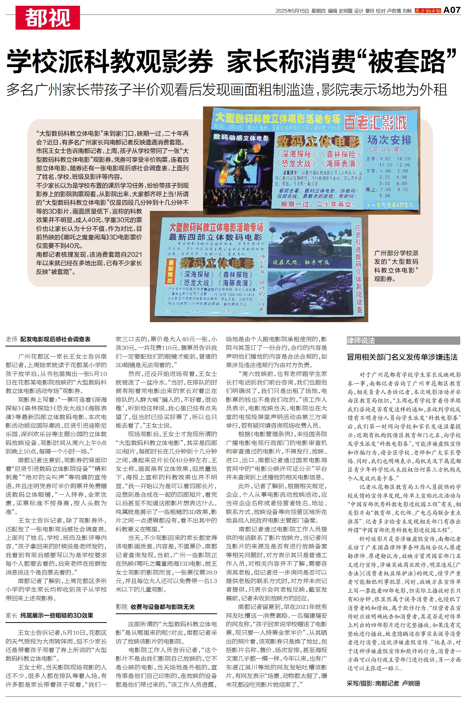 不少家长以为是学校布置的课后学习任务,纷纷带孩子到观影券上的影院购票观看。从影院出来,大家都齐呼上当!所谓的“大型数码科教立体电影”仅是四段几分钟到十几分钟不等的3D影片,画面质量低下,宣称的科教效果并不明显。成人40元、学童30元的票价也让家长认为十分不值,作为对比,目前热映的《哪吒之魔童闹海》3D电影票价仅需要不到40元。