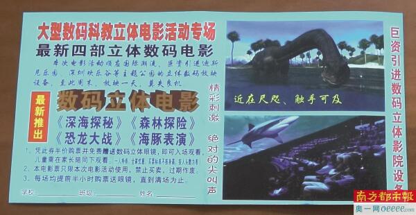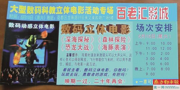 观影券上写着:“一票可连看《深海探秘》《森林探险》《恐龙大战》《海豚表演》等最新四部立体数码电影。本次电影活动顺应国际潮流,巨资引进迪斯尼乐园、深圳欢乐谷等主题公园的立体数码放映设备。观影时间从周六上午9点到晚上10点,每隔一个小时一场。”