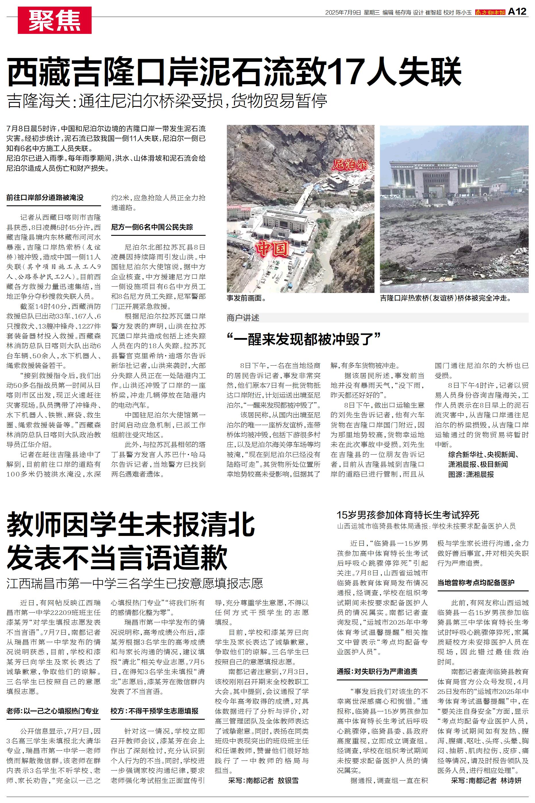 7月8日晨5时许,中国和尼泊尔边境的吉隆口岸一带发生泥石流灾害。经初步统计,泥石流已致我国一侧11人失联,尼泊尔一侧已知有6名中方施工人员失联。