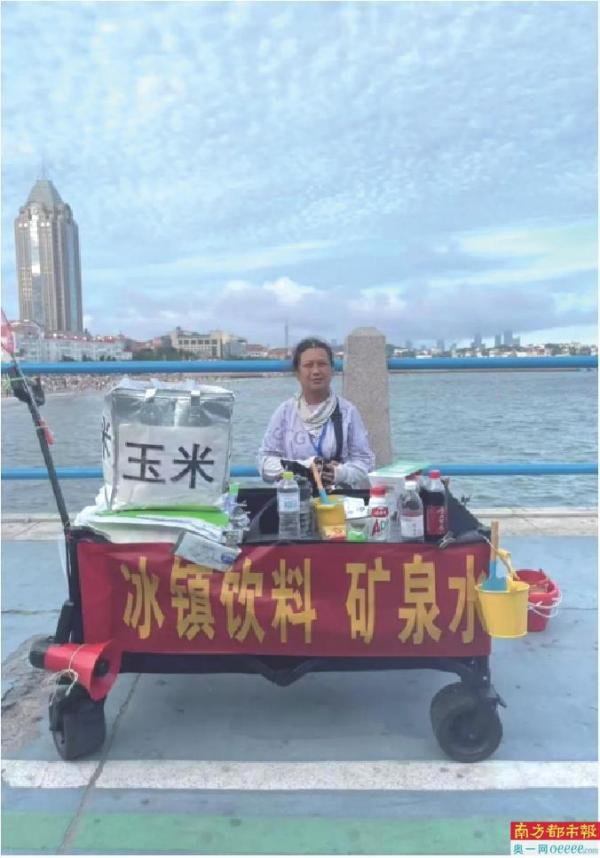 刘玉荣在李慰农公园附近卖玉米。 图源:青岛早报