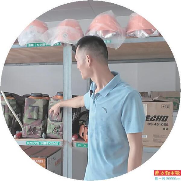 热水镇林业工作站办事员王英豪介绍防灭火设备。 实习生 赖魏楚 摄
