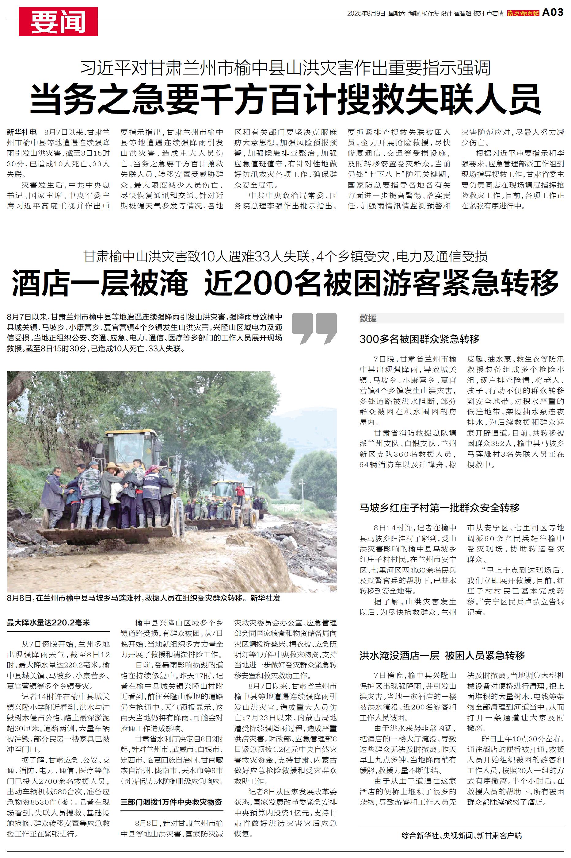 据了解,甘肃应急、公安、交通、消防、电力、通信、医疗等部门已投入2700余名救援人员,出动车辆机械980台次,准备应急物资8530件(套)。记者在现场看到,失联人员搜救、基础设施抢修、群众转移安置等应急救援工作正在紧张进行。