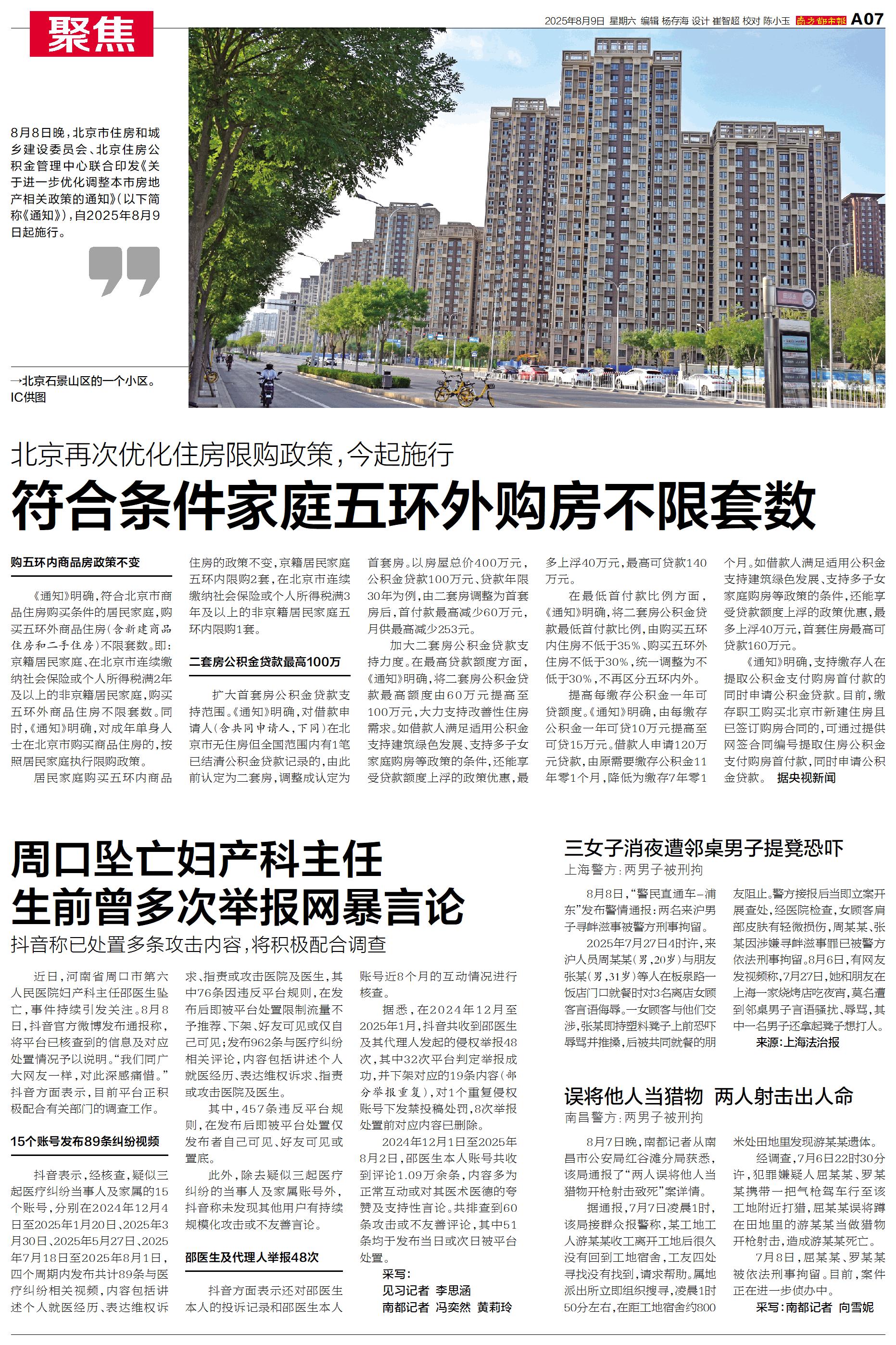 8月8日晚,北京市住房和城乡建设委员会、北京住房公积金管理中心联合印发《关于进一步优化调整本市房地产相关政策的通知》,自2025年8月9日起施行。