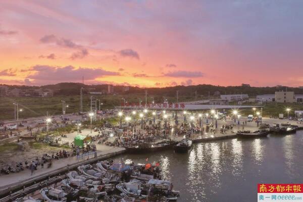 揭阳惠来县的神泉港码头,橘红霞光悬挂在天际线,一艘艘渔船满载而归。