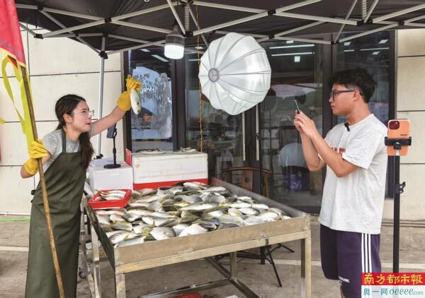 镜头在活蹦乱跳的渔获和飞快打包的双手间切换,主播提着鲜鱼在直播间吆喝。