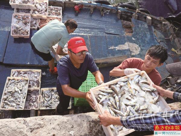 第一批渔获新鲜上岸,渔民们正马不停蹄地进行着运输接力。