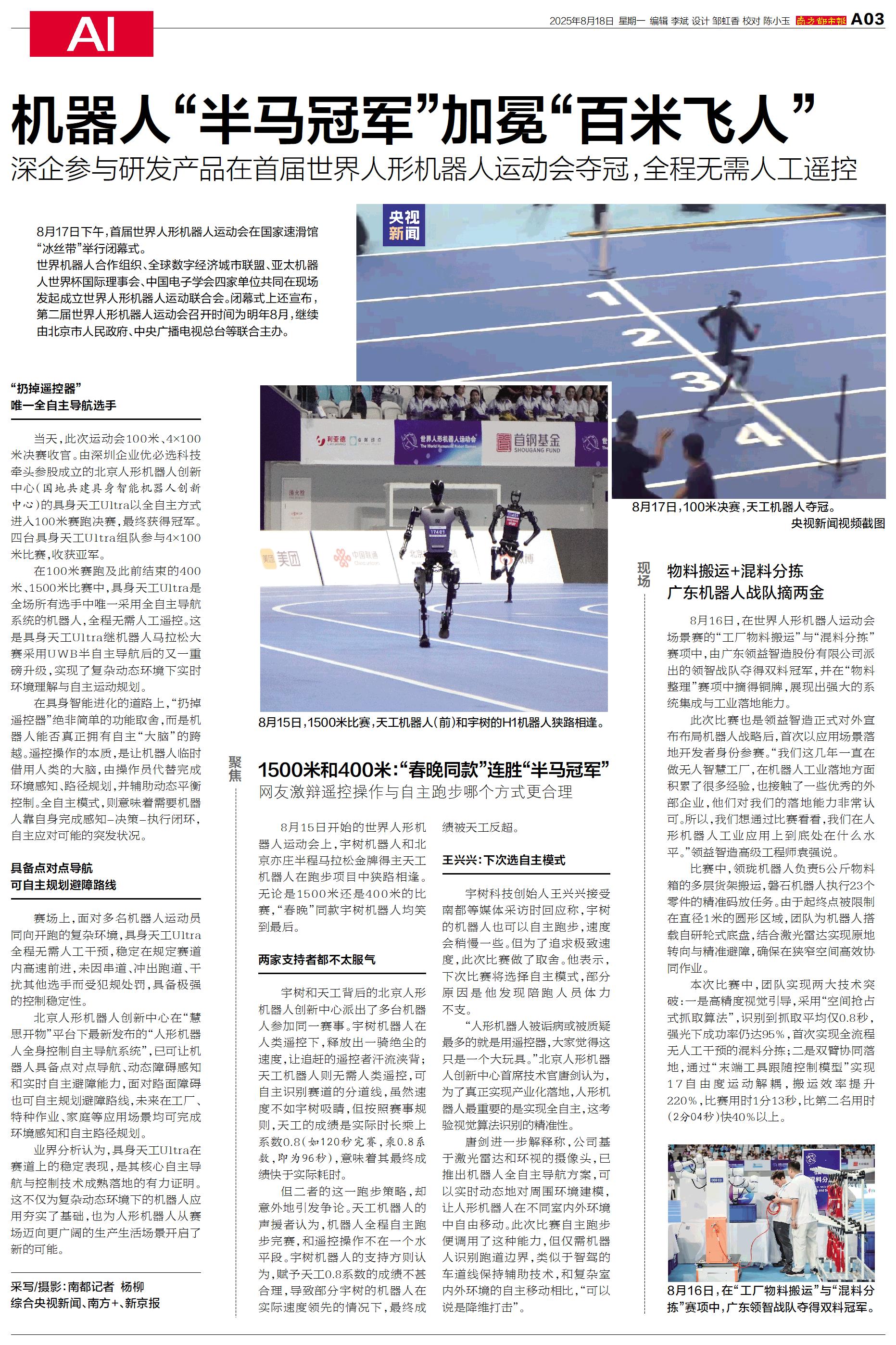 当天,此次运动会100米、4×100米决赛收官。由深圳企业优必选科技牵头参股成立的北京人形机器人创新中心(国地共建具身智能机器人创新中心)的具身天工Ultra以全自主方式进入100米赛跑决赛,最终获得冠军。四台具身天工Ultra组队参与4×100米比赛,收获亚军。