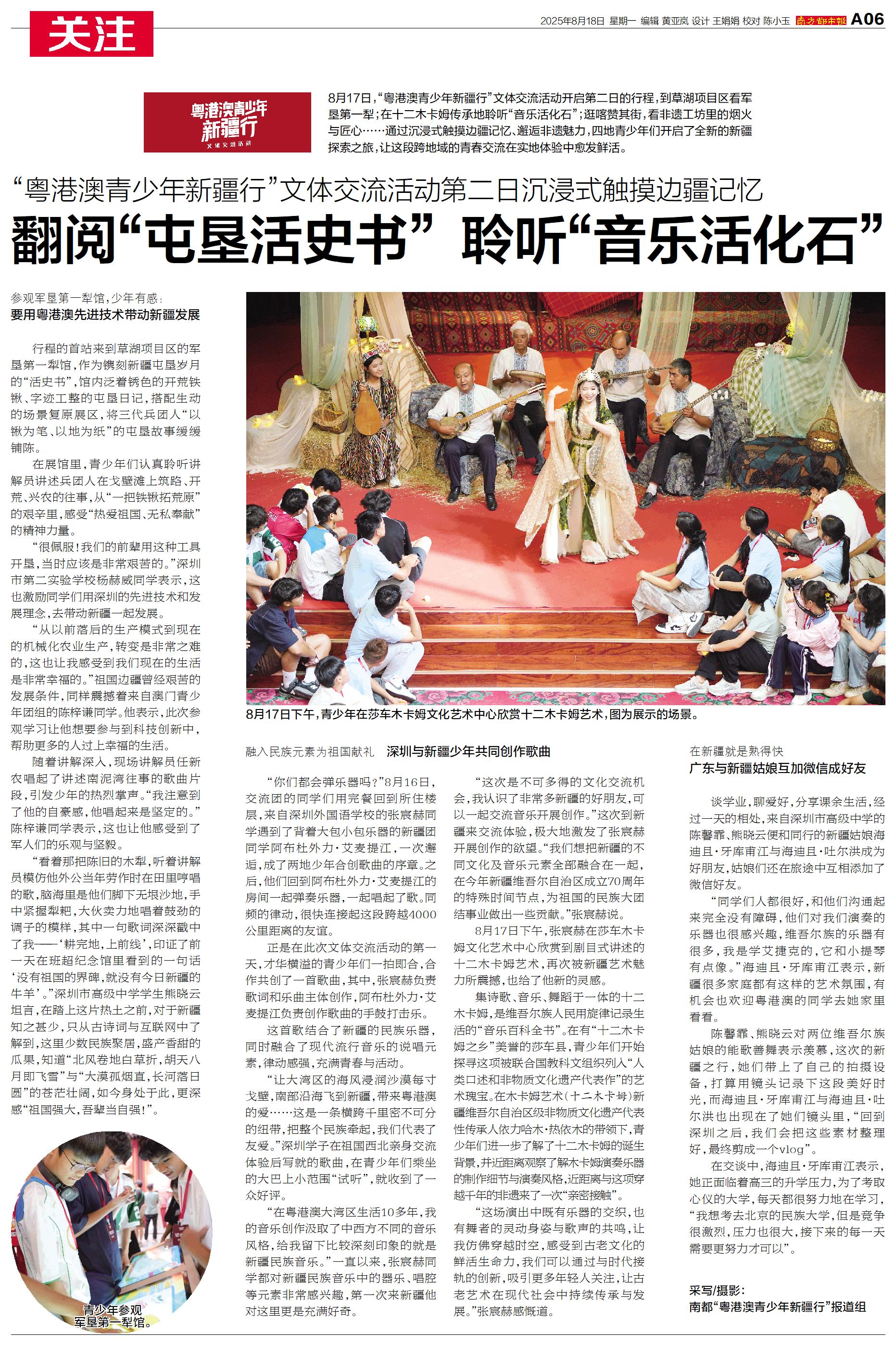 “让大湾区的海风浸润沙漠每寸戈壁,南部沿海飞到新疆,带来粤港澳的爱……这是一条横跨千里密不可分的纽带,把整个民族牵起,我们代表了友爱。”深圳学子在祖国西北亲身交流体验后写就的歌曲,在青少年们乘坐的大巴上小范围“试听”,就收到了一众好评。