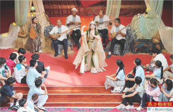 8月17日下午,青少年在莎车木卡姆文化艺术中心欣赏十二木卡姆艺术,图为展示的场景。