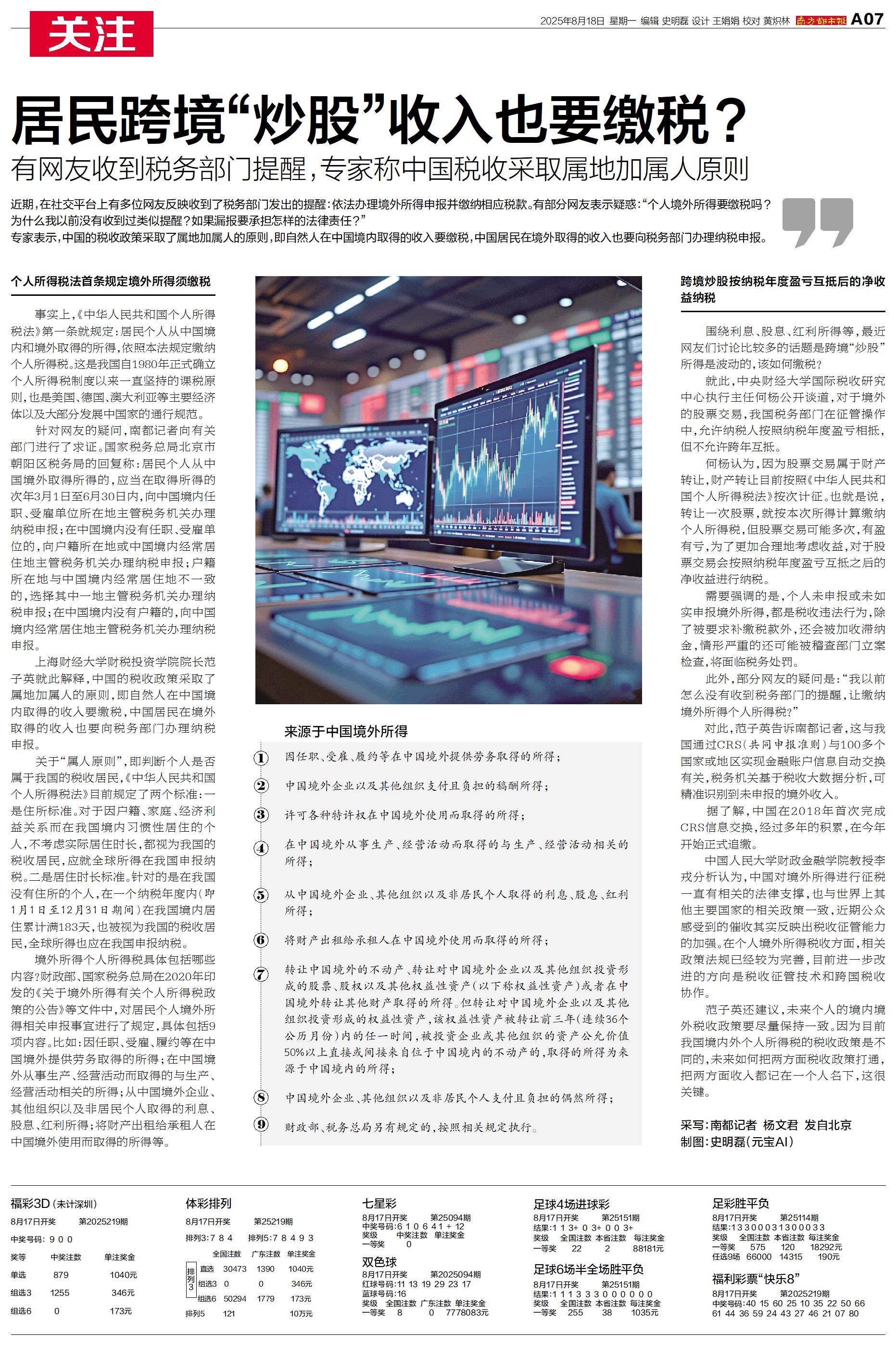 上海财经大学财税投资学院院长范子英就此解释,中国的税收政策采取了属地加属人的原则,即自然人在中国境内取得的收入要缴税,中国居民在境外取得的收入也要向税务部门办理纳税申报。