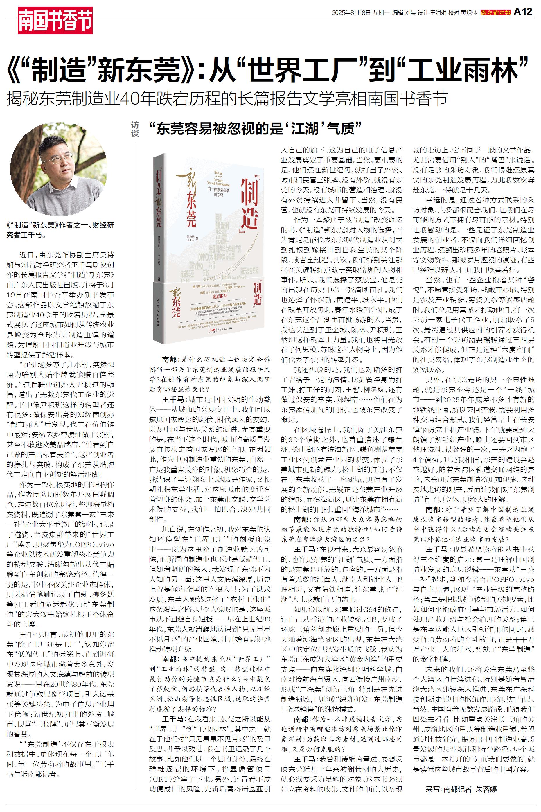 “‘东莞制造’不仅存在于报表和数据中,更体现在每一个工厂车间、每一位劳动者的故事里。”王千马告诉南都记者。