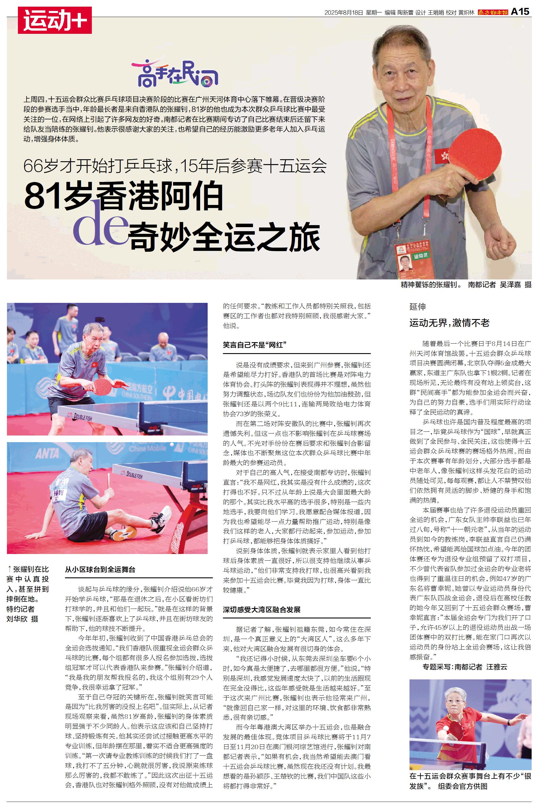 上周四,十五运会群众比赛乒乓球项目决赛阶段的比赛在广州天河体育中心落下帷幕。在晋级决赛阶段的参赛选手当中,年龄最长者是来自香港队的张耀钊,81岁的他也成为本次群众乒乓球比赛中最受关注的一位,在网络上引起了许多网友的好奇。南都记者在比赛期间专访了自己比赛结束后还留下来给队友当陪练的张耀钊。他表示很感谢大家的关注,也希望自己的经历能激励更多老年人加入乒乓运动,增强身体体质。