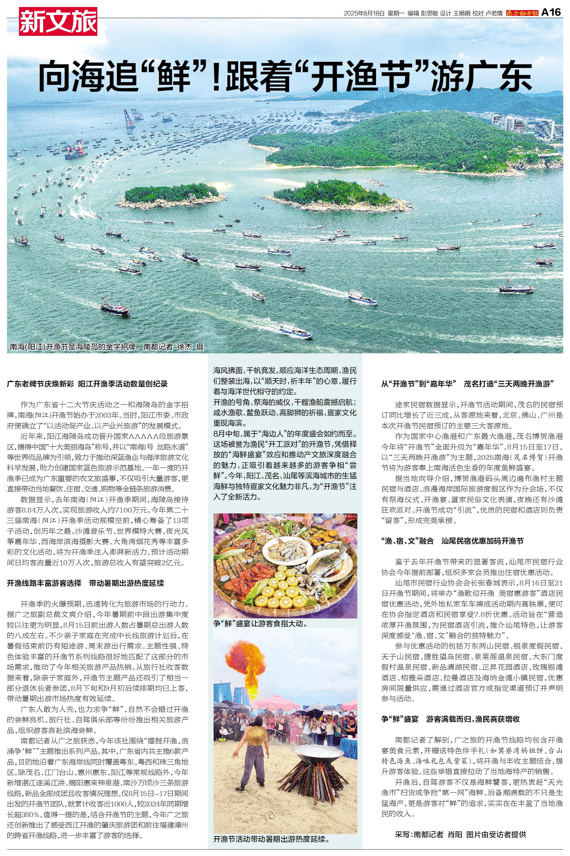 南都记者从广之旅获悉,今年该社围绕“擂鼓开渔,浪涌争‘鲜’”主题推出系列产品。其中,广东省内共主推6款产品,目的地沿着广东海岸线同时覆盖粤东、粤西和珠三角地区。除茂名、江门台山、惠州惠东、阳江等常规线路外,今年新增湛江遂溪江洪、揭阳惠来神泉港、南沙万顷沙三条旅游线路,新品全部成团且收客情况理想。仅8月15日-17日期间出发的开渔节团队,就累计收客近1000人,较2024年同期增长超380%。值得一提的是,结合开渔节的主题,今年广之旅还创新推出了感受西江开渔的肇庆旅游团和前往福建漳州的跨省开渔线路,进一步丰富了游客的选择。